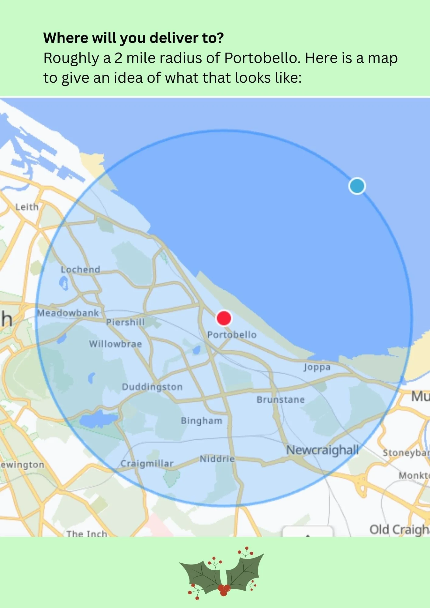 We are only able to deliver to within 2 miles of Portobello. See map below.